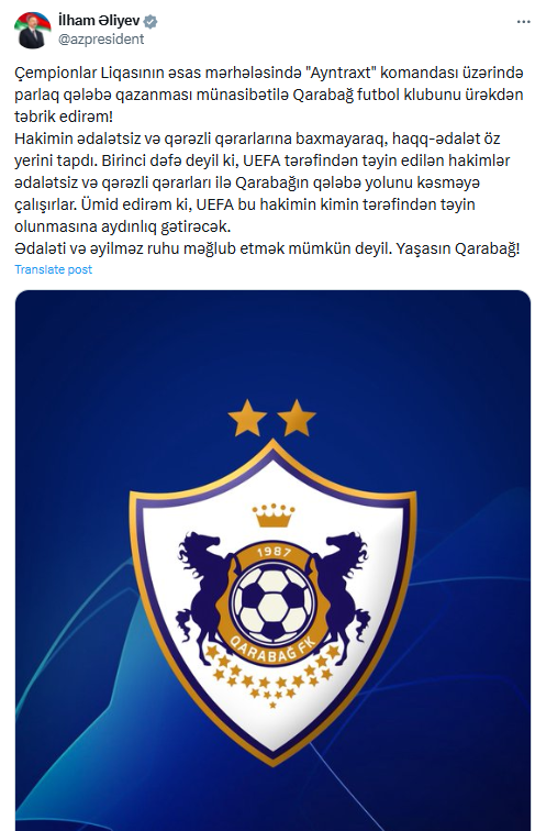 "Çempionlar Liqasının əsas mərhələsində "Ayntraxt" komandası üzərində parlaq qələbə qazanması münasibətilə Qarabağ futbol klubunu ürəkdən təbrik edirəm!